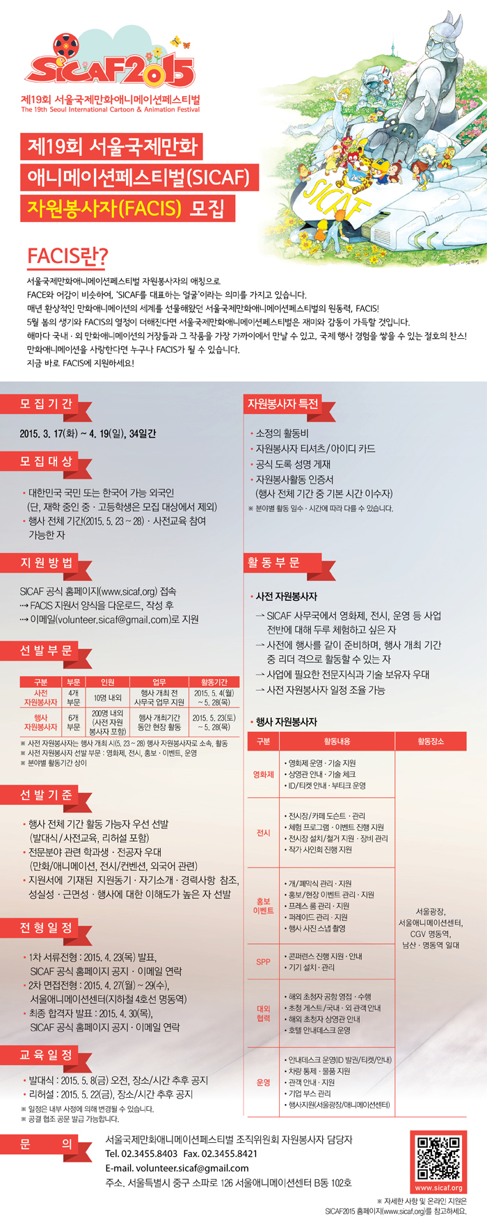 제 19회 서울국제만화 애니메이션 페스티벌(SICAF) 자원봉사자(FACIS)를 모집합니다.