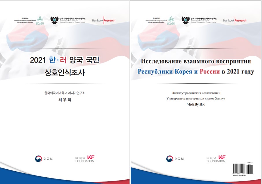 한국외국어대학교 러시아연구소는  ' 2021  · 러 양국 국민 상호인식조사 ' 를 출판했다 이 책은  2021 년  3 월 러시아 국민을 대상으로 한국에 대한 인식조사를 한 결과와  2021 년  9 월 한국 국민을 대상으로 러시아에 대한 인식조사를 한 결과를 담고 있다 한국에서는  한국리서치 (Hankook Research) 러시아에서는 러시아여론조사센터 ( 프치옴 ВЦИОМ ) 가 설문조사를 수행했다 .