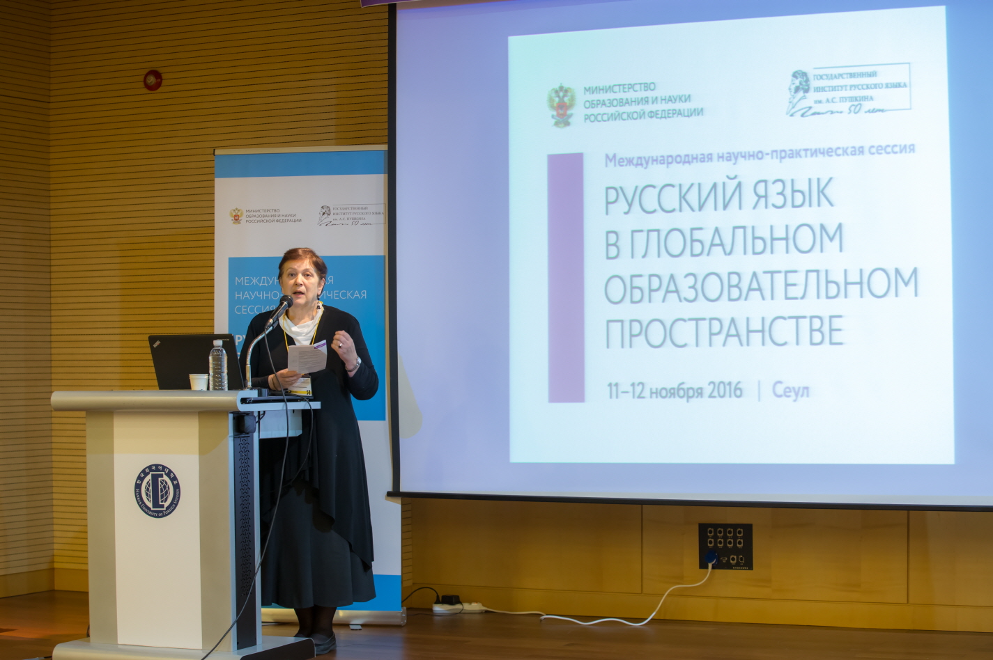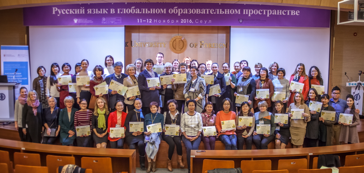 러시아연구소 ( 소장 김현택 ) 는  2016 년  11 월  11 ( )~12( 양일 간 푸시킨언어대학 측과 공동으로  Русский язык в глобальном образовательном пространстве ”( 글로벌 교육 공간에서의 러시아어 ) 라는 주제로 러시아어 교수법 세미나를 개최했다 루세츠카야 푸시킨언어대 총장 김현택 러시아연구소장 주한 러시아대사관 볼코프 참사관 주한 러시아대외협력청 부로빈 소장 KRBC  박종호 대표의 개회사 및 축사로 개막된 본 행사에는 사전 신청 인원 수를 훨씬 상회하는  120 명이 넘는 인원이 참석했다 세미나에는 다양한 주제의 강연이 이루어졌는데 특히 코레파노바 교수의 한국 일본 중국을 중심으로 한 아시아권 러시아어 학습자들의 사례를 중심으로  국가별 특성을 고려한 발음과 억양 교육 ”  강연과 루브료바 교수의  모바일 환경에 기반한 러시아어 교수법 ”  강연은 청중의 큰 호응을 불러 일으켰다 사전 접수를 통해 신청한 참가자들에 한해 수료증 수여가 이루어졌으며 본 행사 외에 별도로 마련된 부스에서는 외국인 러시아어 학습자를 위한 신간 서적 전시회도 열렸다