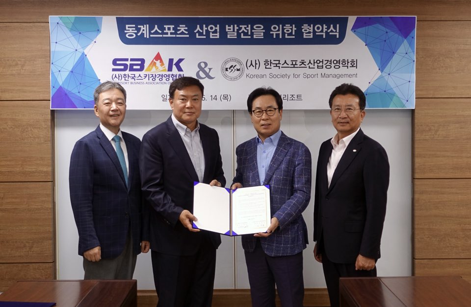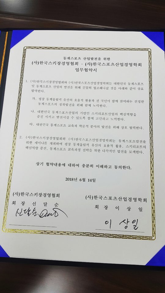 2018년 6월 14일 (사)한국스키장경영협회와 (사)한국스포츠산업경영학회 간 동계스포츠 산업 발전을 위한 업무협약식이 있었습니다.