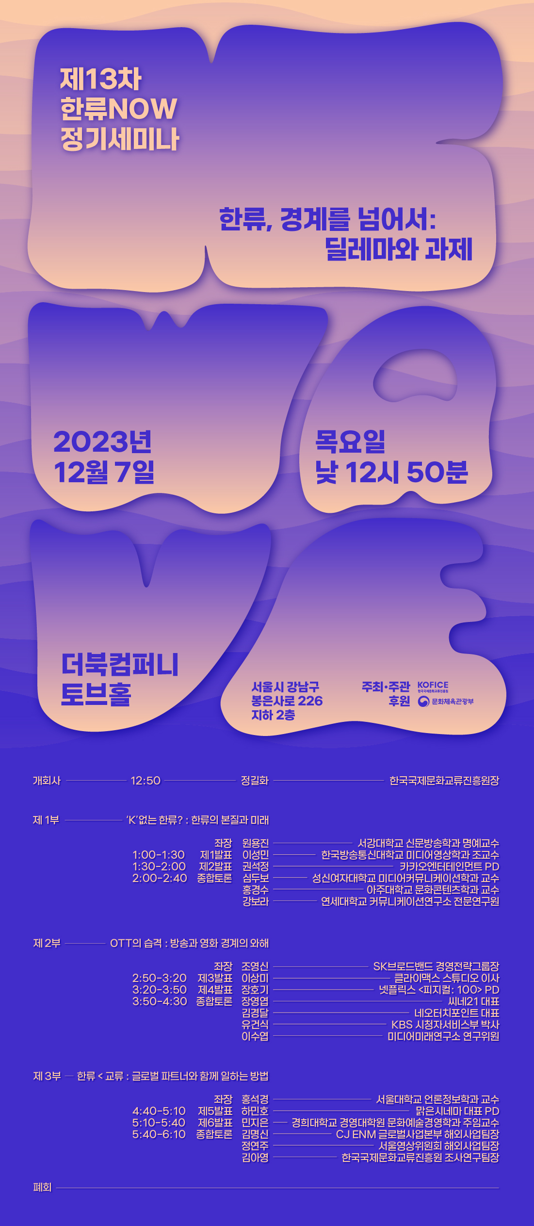 문화체육관광부와 한국국제문화교류진흥원(KOFICE)은 문화산업 전문가들의 연간 핵심 한류 이슈 분석과 토론을 통해 민관산학연 (民官産學硏) 에 시의적절한 한류 관련 아젠다를 제시하고자 13 차 한류나우   정기세미나 를 개최합니다 .   한류와 문화콘텐츠 , 국제문화교류에 관심 있는 분들의 많은 참여 바랍니다 .
