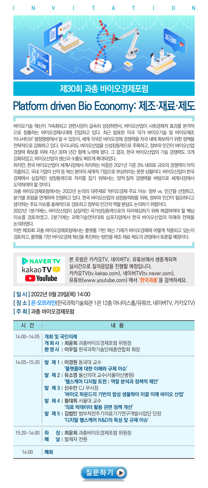 [과총 바이오경제포럼] Platform driven Bio Economy 제조·재료·제도(9.29(목) 14시)