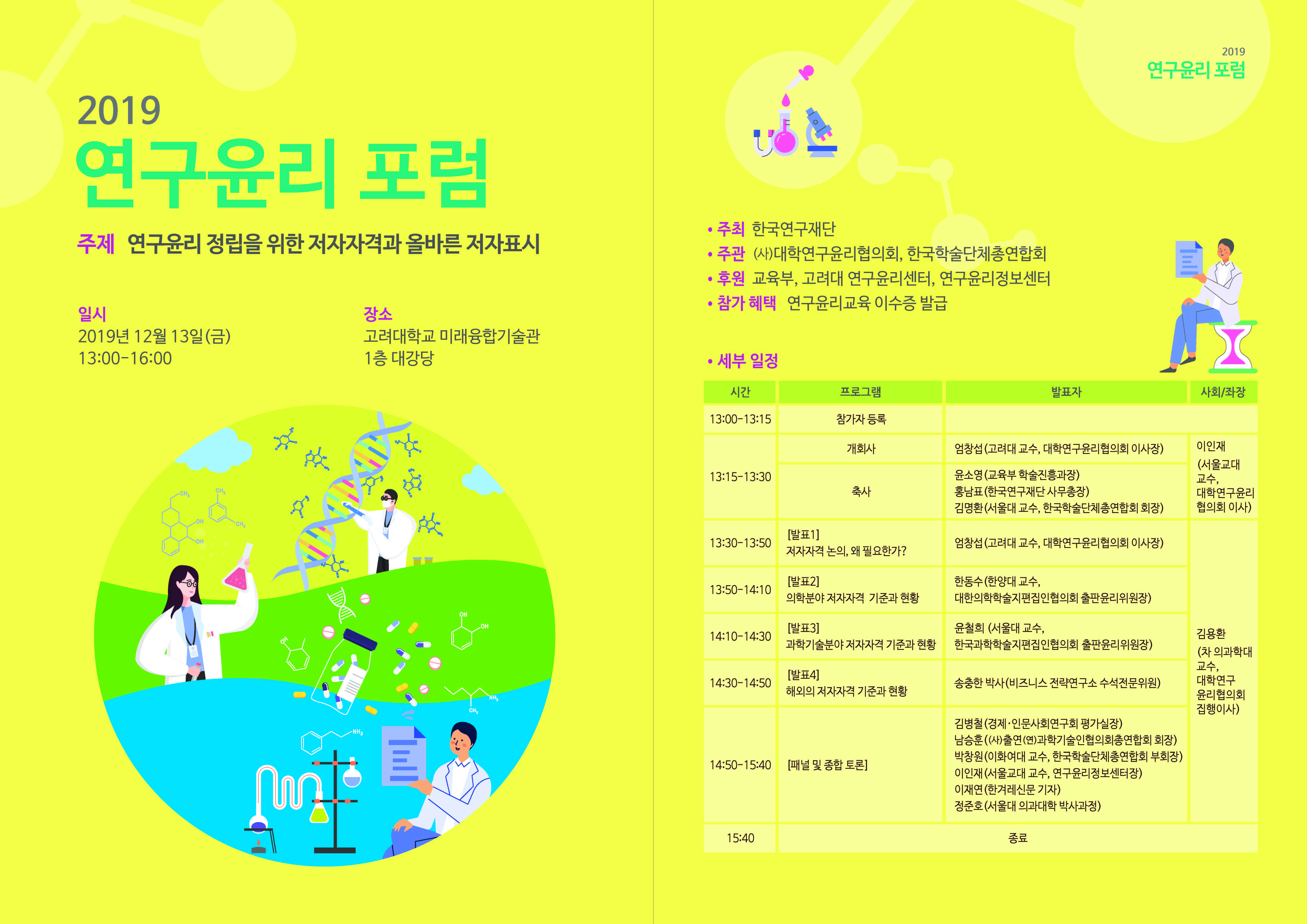한국연구재단이 주최하는 '연구윤리 정립을 위한 저자자격과 올바른 저자표시'라는 주제의「2019 연구윤리 포럼」참석했습니다.