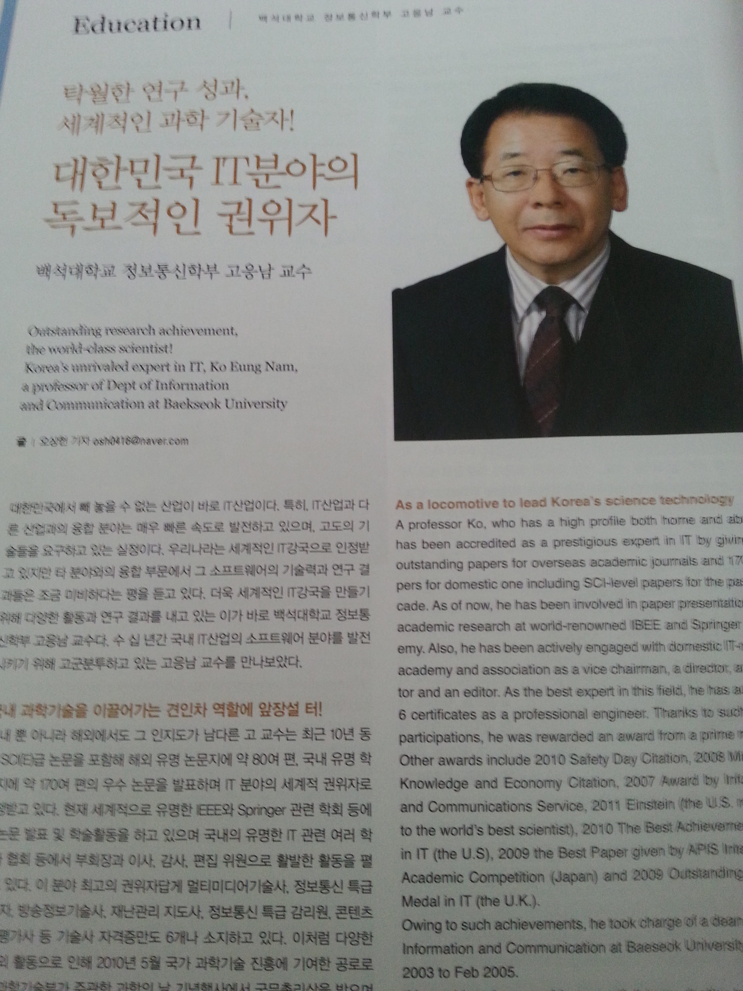 백석대학교 고응남교수께서 Power Korea에 탁월한 연구성과,세계적인 과학기수자로 소개 되었습니다.