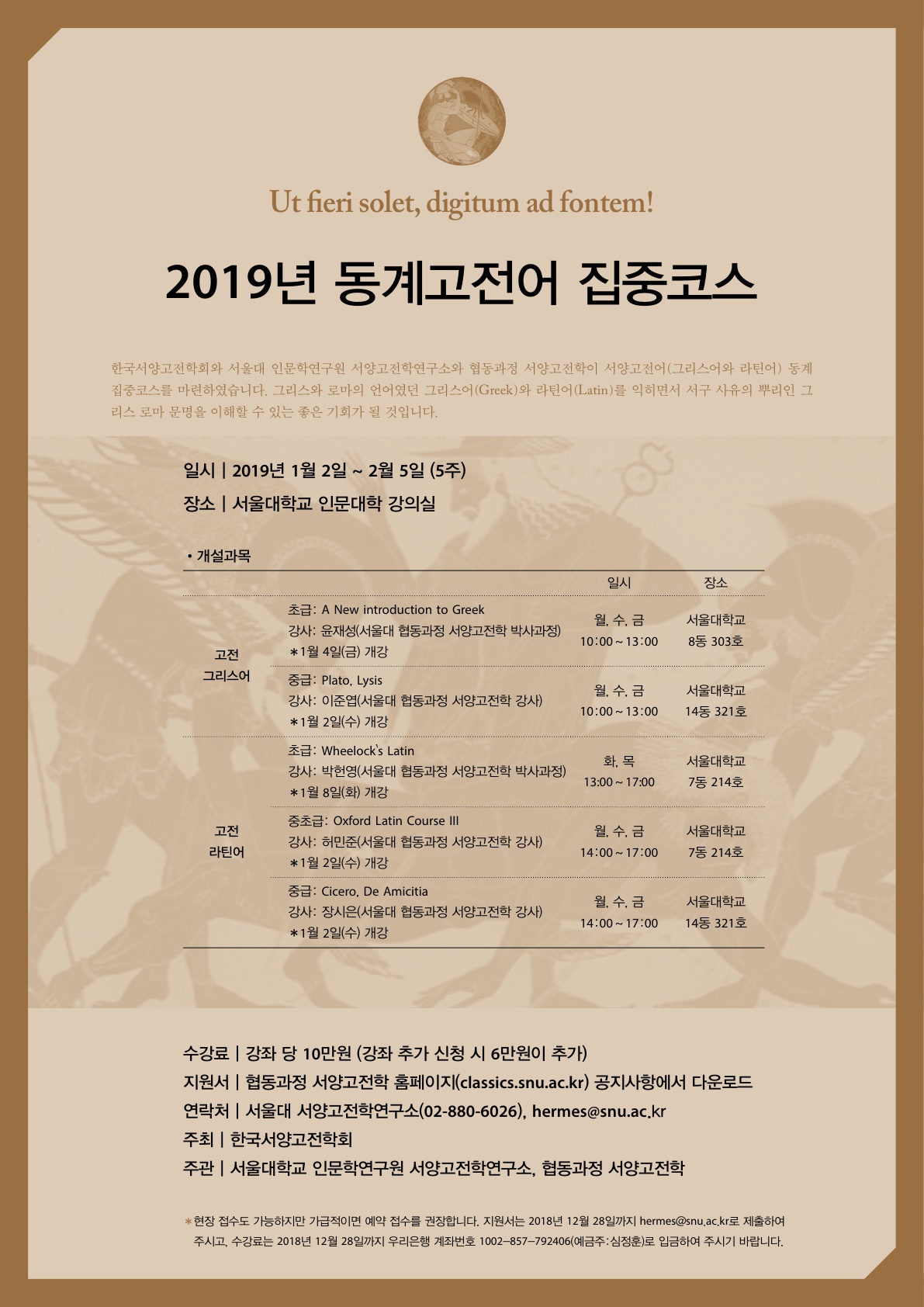 한국서양고전학회와 서울대 인문학연구원 서양고전학연구소와 협동과정 서양고전학이 서양고전어(그리스어와 라틴어) 동계집중코스를 마련하였습니다. 그리스와 로마의 언어였던 그리스어(Greek)와 라틴어(Latin)를 익히면서 서구 사유의 뿌리인 그리스 로마 문명을 이해할 수 있는 좋은 기회가 될 것입니다.