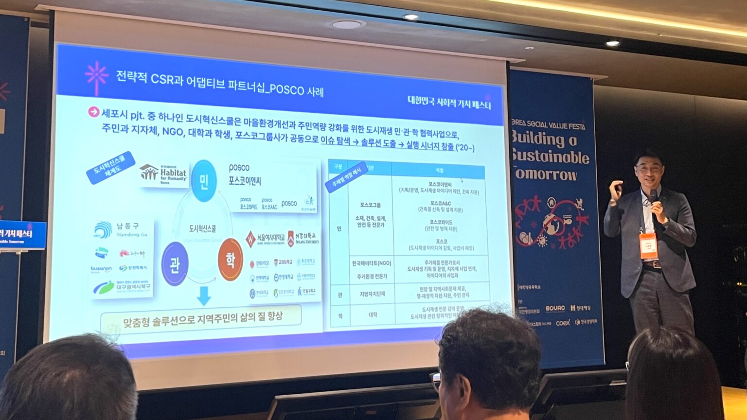 기업관계자들이 직접 전략적 CSR 활동 사례를 소개하는 자리도 이어졌다. 나영훈 포스코 지속가능경영실 사회공헌그룹장은 포스코의 ‘도시혁신 스쿨’을 소개하며, 지자체, 대학, NGO 등과 협력하며 실제 주민이 필요로 하는 도시재생 아이디어를 발굴할 수 있었다고 밝혔다. 지금까지 의정부 신흥마을, 전주 도토리골, 부산진구 밭개마을, 창원 신월지구 등 다양한 지역의 도시재생 아이디어가 도출됐으며, 신월지구에는 주민들의 의견을 수렴해 포스코건설의 모듈러하우스 공법을 적용해 주민공용공간이 만들어졌다.