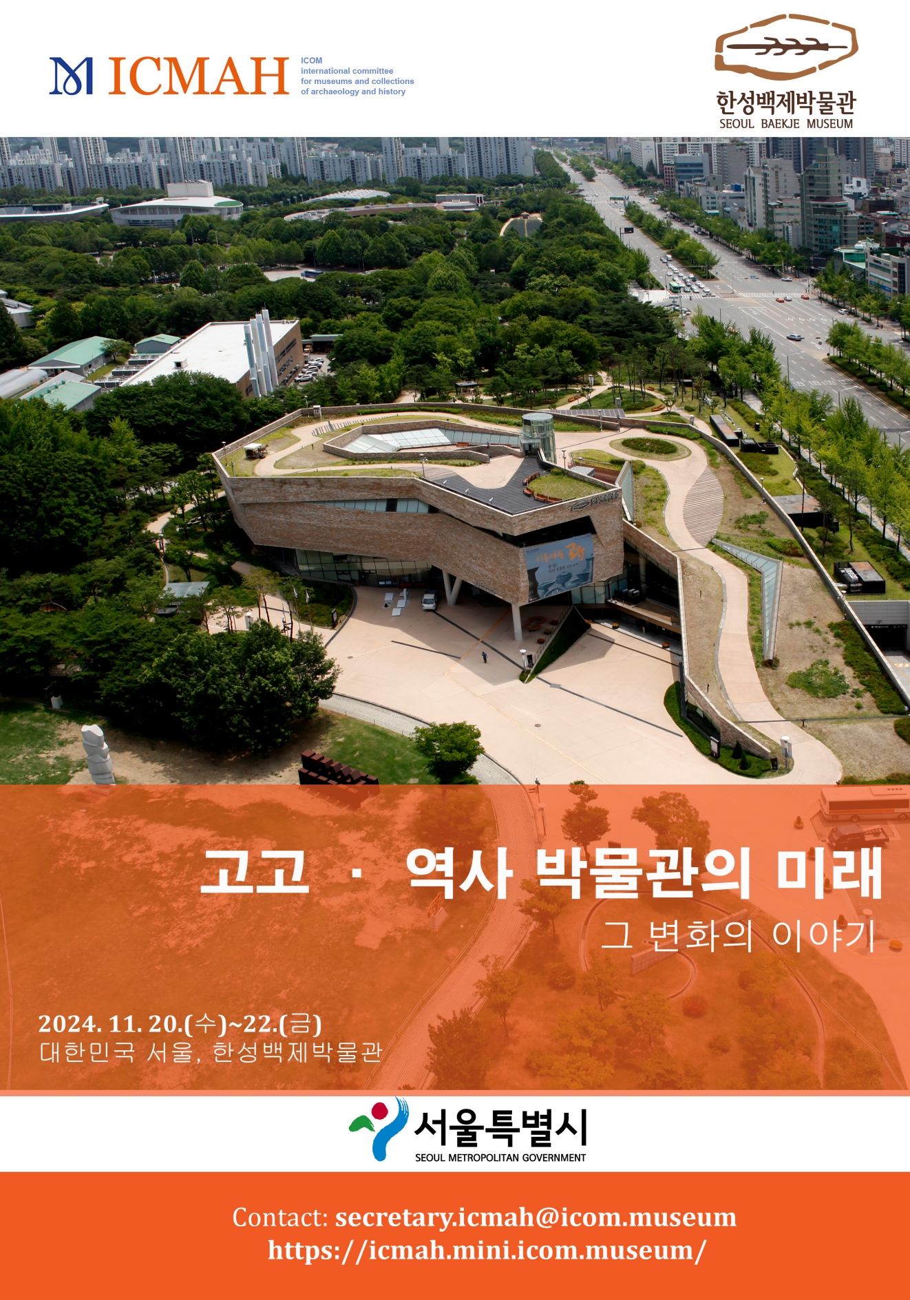 2024 ICOM ICMAH 국제학술회의가 11월 20~22일 서울 한성백제박물관에서 개최됩니다. ICOM-ICMAH(국제고고학역사박물관위원회)는 매년 세계 각국의 고고학 및 역사와 관련된 수집품과 박물관과 관련된 학술회의를 개최해왔습니다이번 학술회의는 "고고·역사 박물관의 미래"라는 주제로 ICOM-ICMAH와 서울특별시한성백제박물관이 공동주최합니다.