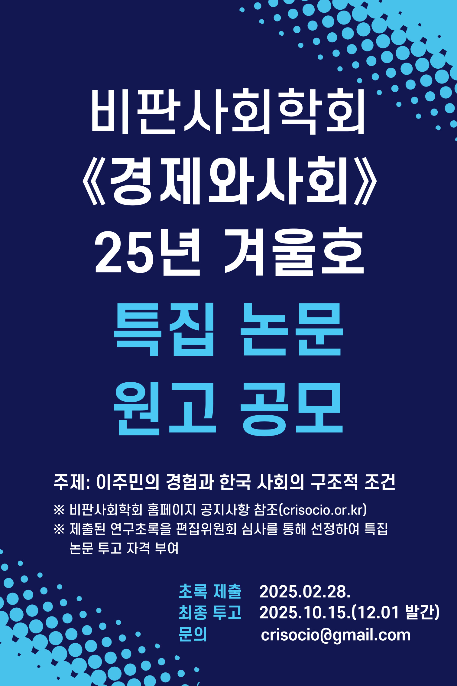 이 주제에 관심이 있는 연구자는 2025228까지 연구 초록을 경제와사회편집위원회(crisocio@gmail.com)에 제출해 주십시오. 편집위원회의 심사를 거쳐 투고 여부가 결정된 뒤에 원고를 작성하게 됩니다(필수는 아니지만 비판사회학회 학술회의 발표를 권장합니다). 투고된 원고는 편집 규정에 따라 소정의 심사를 거쳐 게재 여부를 확정합니다. 특집 원고의 최종 마감일은 20251015입니다.