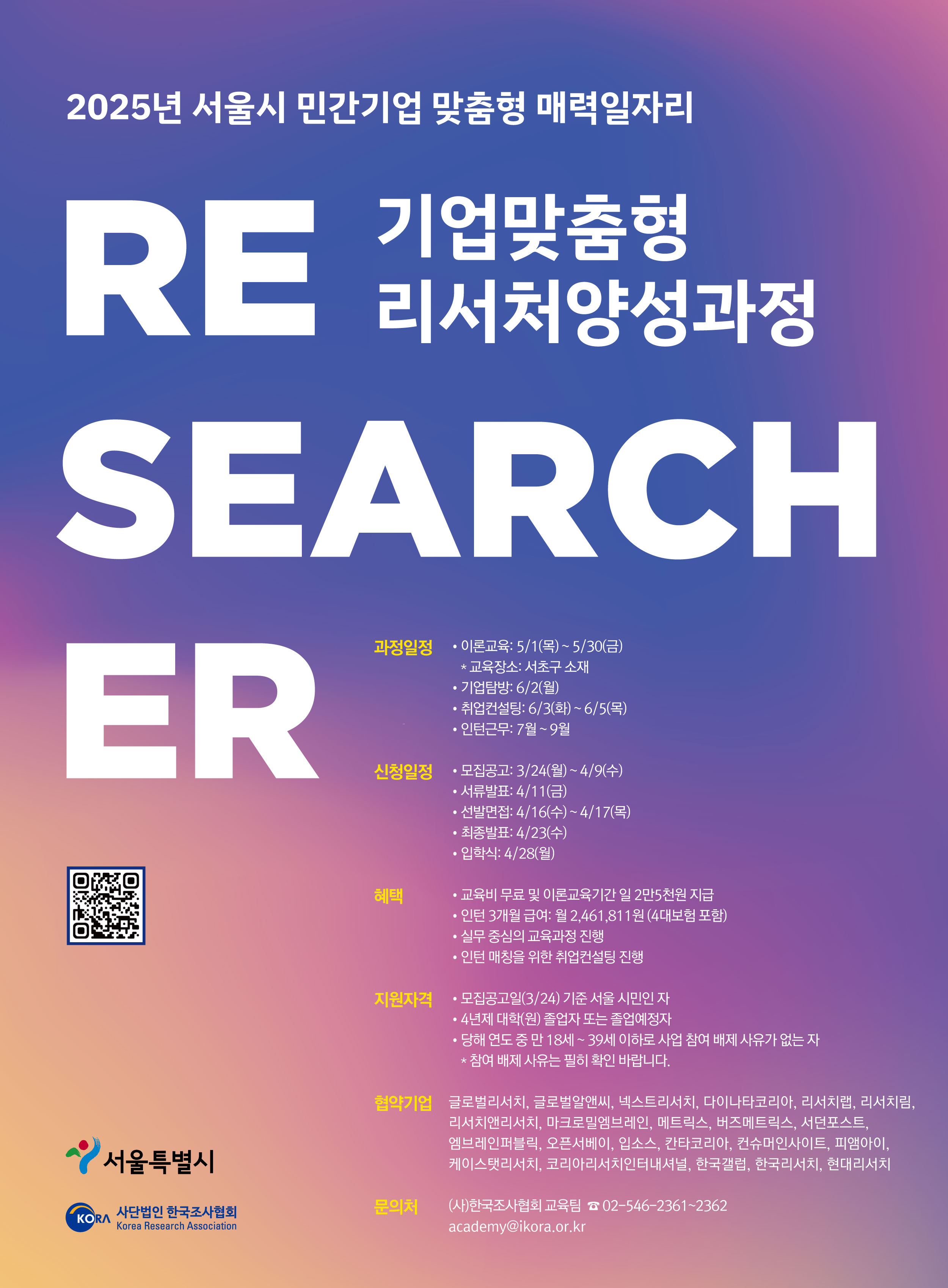 (사)한국조사협회에서는 신임리서처 양성을 위한 전문교육을 실시하고 인턴쉽 과정을 통해 정규직 일자리로 취업을 지원하고자 2025년 서울시 민간기업 맞춤형 매력일자리 사업 「기업맞춤형 리서처양성과정」 참여자를 아래 첨부파일과 같이 모집하오니 많은 관심과 참여 바랍니다.