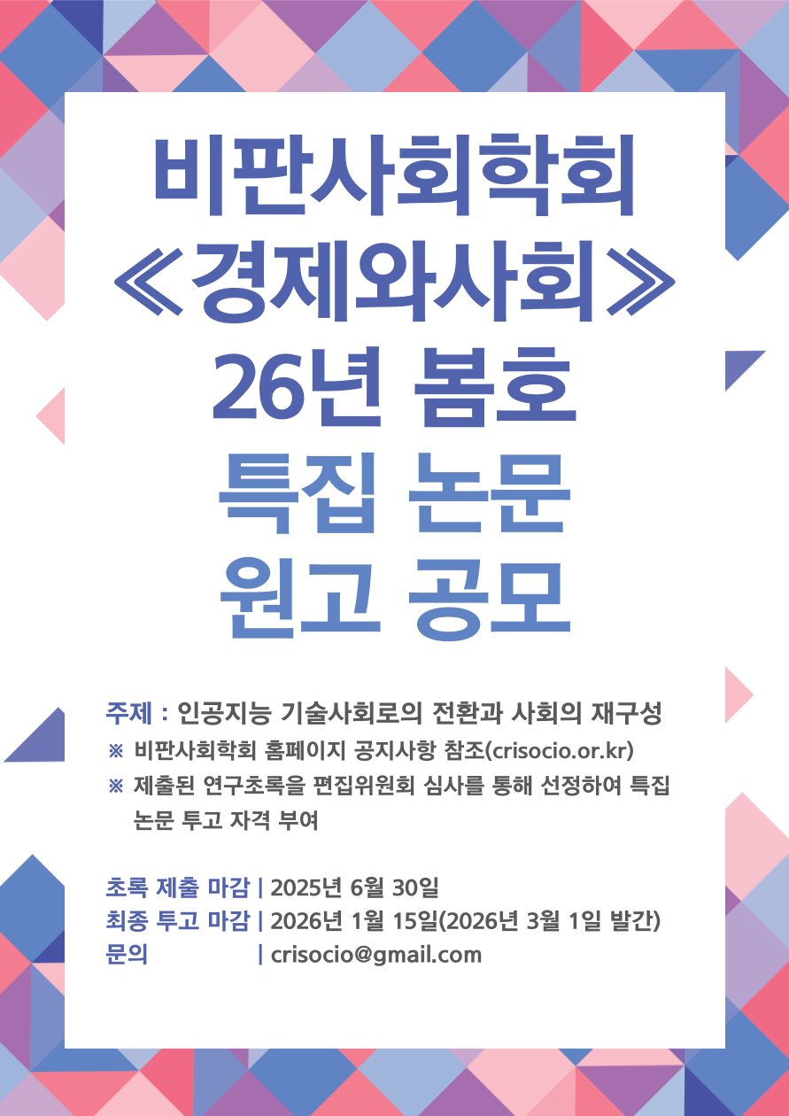 경제와사회≫ 149(20263월 발간 예정특집논문 원고 공모 내용을 안내드립니다.