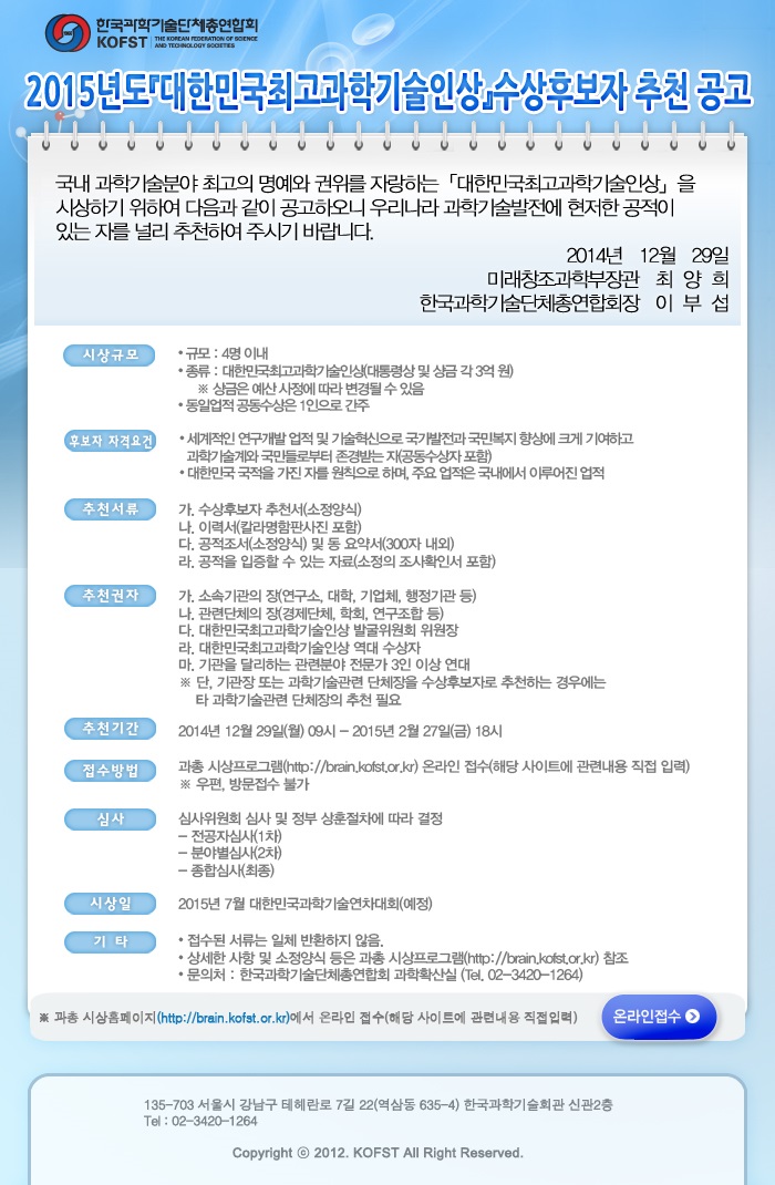 한국과학기술단체 총연합회에서 대한민국최고과학기술인상을 시상한다고 하오니 많은 참여 바랍니다.