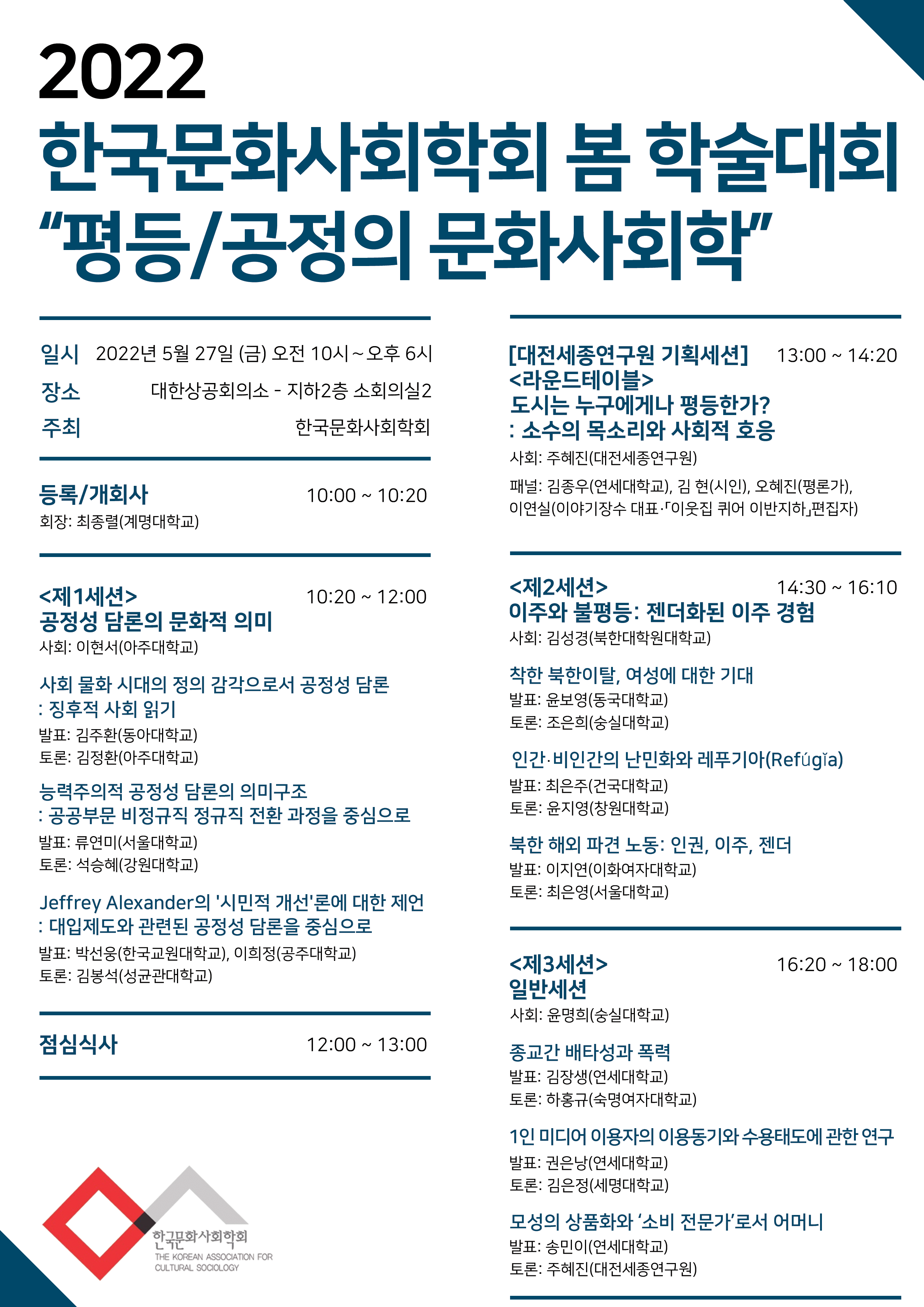 2022년 한국문화사회학회 봄학술대회에서는 다양한 영역에서 표출되고 있는 '평등/공정'과 관련된 사회문화적 현상들을 문화사회학적 시각에서 진단하고 탐색해보고자 합니다이번 봄학술대회에 참여하여 이와 관련한 회원님들의 다양한 시각과 의견을 나누어 주시기를 부탁드립니다.