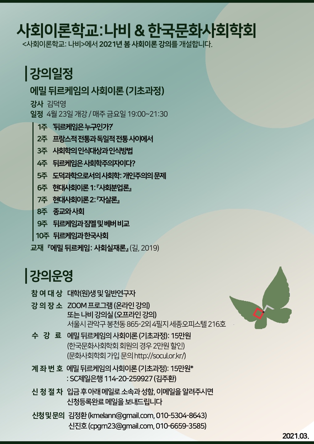 지난 겨울 사회이론 강좌에 이어 올해 봄에도 <한국문화사회학회>와 <사회이론학교:나비>의 공동 기획으로 2021년 봄 사회이론 강좌가 열립니다.