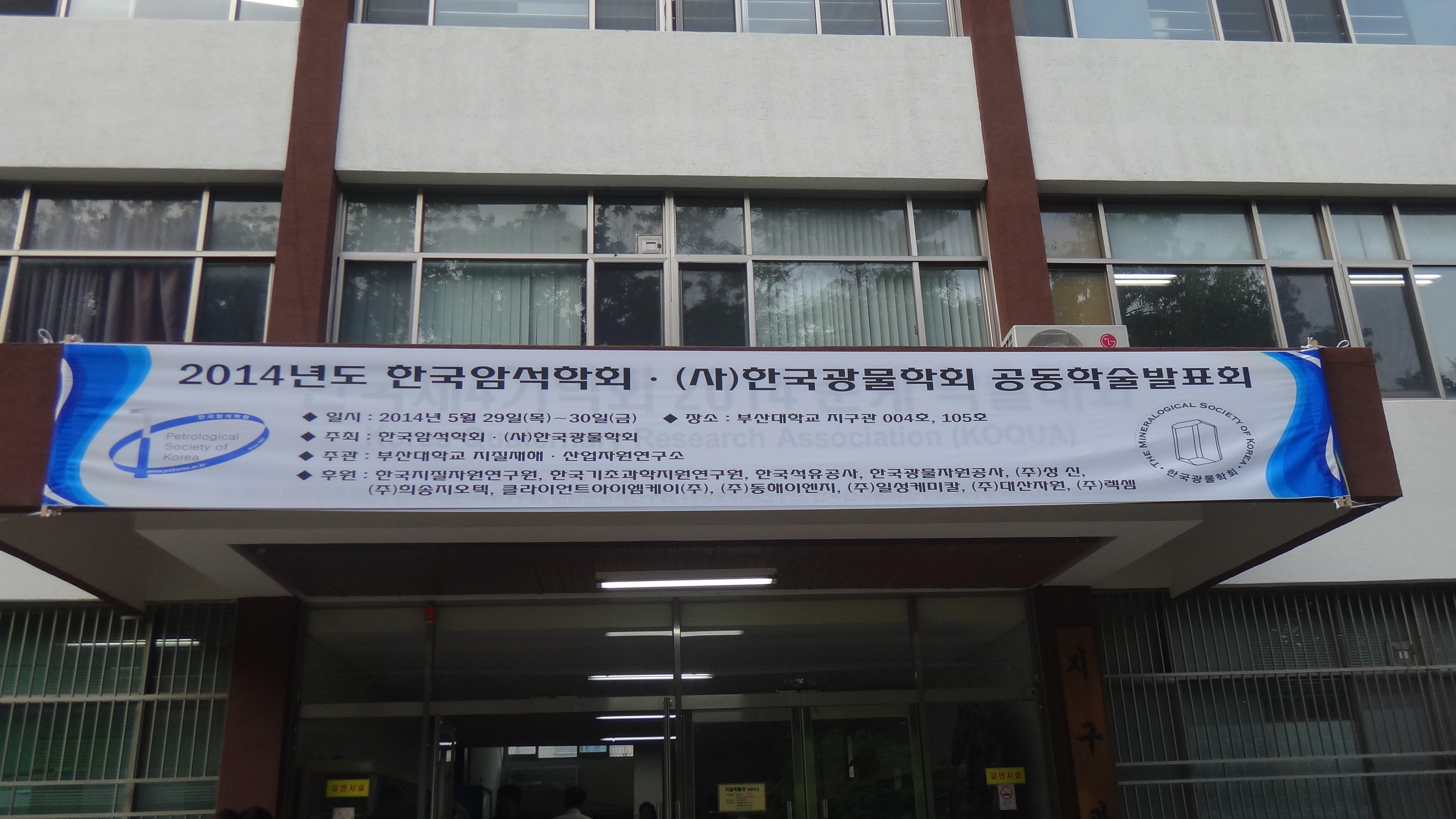 학회장소인 부산대학교 지구관(부산대학교 장전동 부산캠퍼스 414호 건물) 현관 앞에 게시된 프래카드입니다.