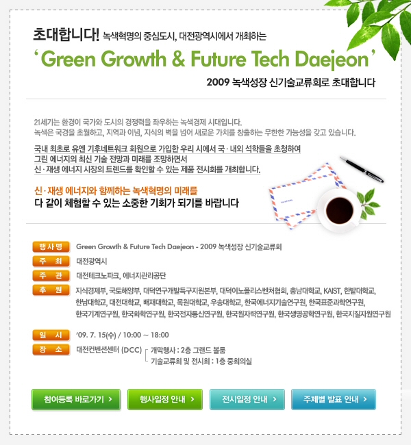참여등록바로가기 : http://www.greendaejeon.or.kr/event/event_01.php 행사일정안내 : http://www.greendaejeon.or.kr/intro/intro_03.php 전시일정안내 : http://www.greendaejeon.or.kr/exhibition/exhibition_01.php 주제별 발표안내 : http://www.greendaejeon.or.kr/program/program_0201.php