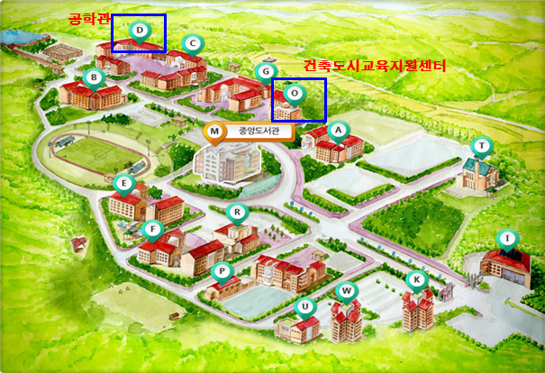 ※ 승용차 이용시: 건축도시교육지원세터(O), 공학관(D) 앞, 주차 후 주차권은 학술대회장소에서 배포